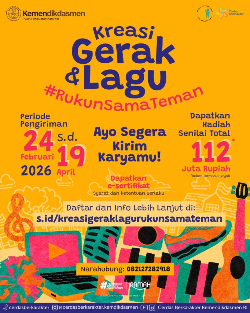 Jakarta, 26 Februari 2026 — Sekolah yang aman dan nyaman tidak hanya dibangun melalui penguatan tata kelola sekolah, tetapi juga melalui pembiasaan nilai dan budaya positif dalam keseharian murid. Sebagai upaya memperkuat kerukunan, toleransi, dan persahabatan di lingkungan sekolah, Kementerian Pendidikan Dasar dan Menengah (Kemendikdasmen) melalui Pusat Penguatan Karakter (Puspeka) menyelenggarakan Kompetisi Kreasi Gerak dan Lagu “Rukun Sama Teman” sebagai bagian dari Gerakan Rukun Sama Teman.