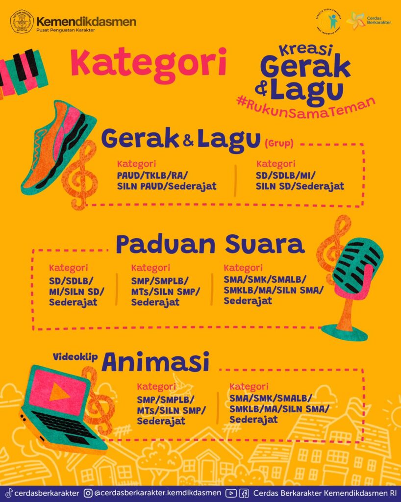 Informasi lengkap mengenai persyaratan dan mekanisme pendaftaran dapat diakses melalui laman resmi Cerdas Berkarakter: https://cerdasberkarakter.kemendikdasmen.go.id/kreasi-gerak-lagu-rukun-sama-teman.