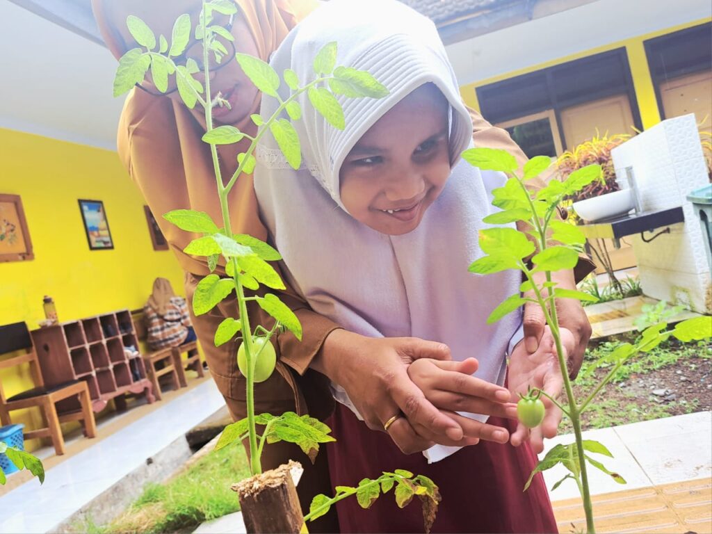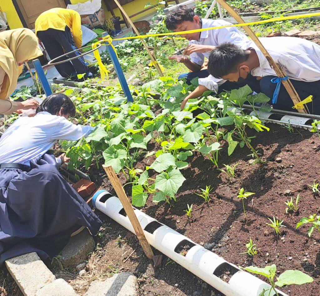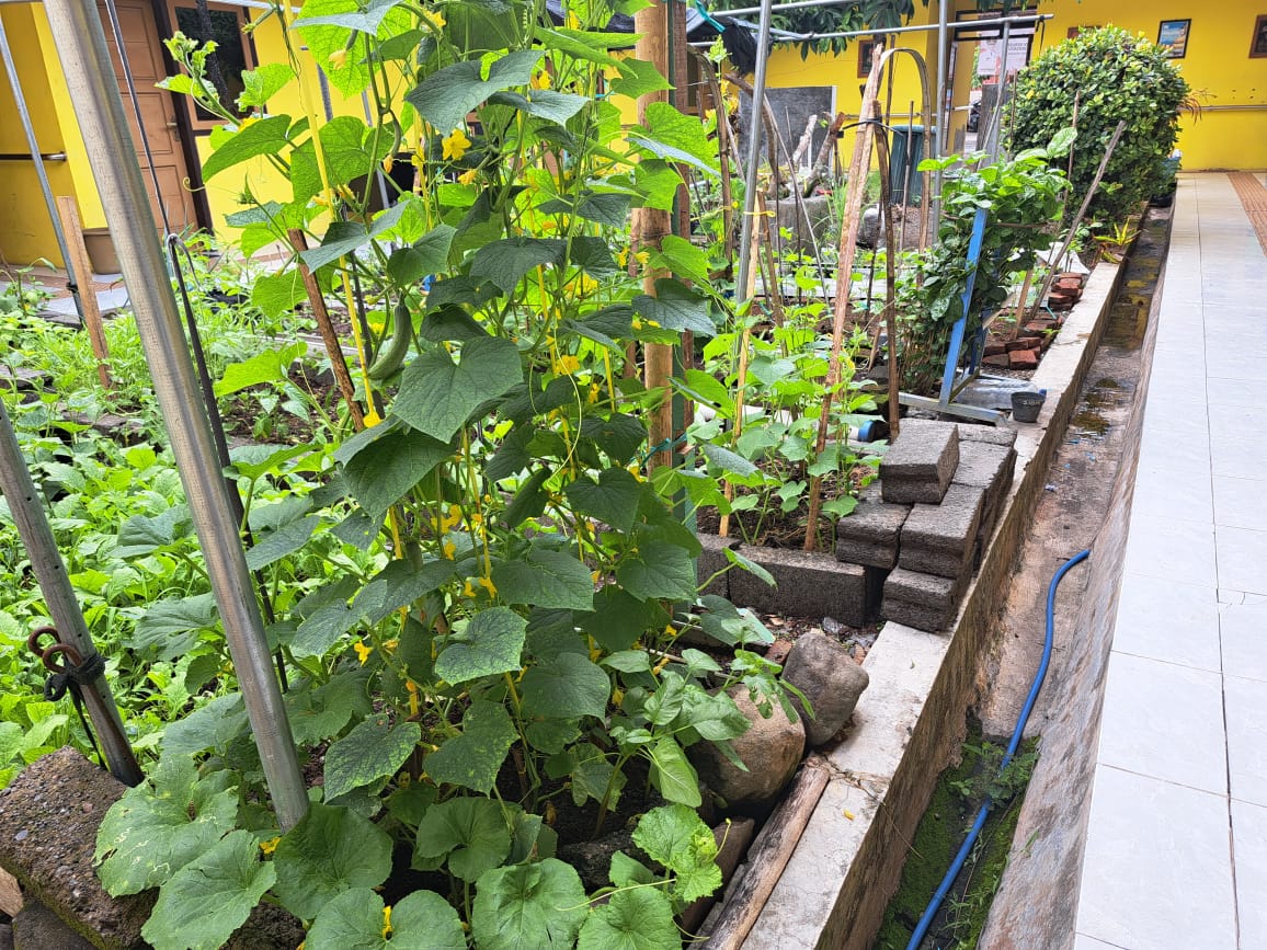 mendalam (deep learning). Dengan memanfaatkan lahan sempit di depan kelas sebagai media belajar, para siswa diajak untuk berinteraksi langsung dengan alam melalui aktivitas berkebun. Kegiatan ini mencakup seluruh proses pertanian sederhana, mulai dari menanam, merawat, hingga mengolah hasil panen. Berbagai jenis sayuran yang ditanam tidak hanya menjadi objek belajar, tetapi juga menjadi sumber pangan sehat. Hasil kebun tersebut digunakan untuk memenuhi kebutuhan konsumsi harian di sekolah, yang secara langsung berkontribusi pada peningkatan asupan gizi seimbang bagi para siswa.